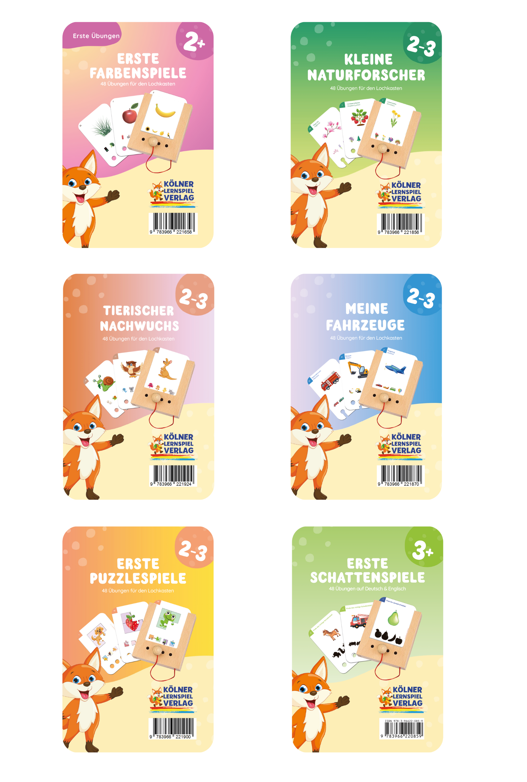 6 Kartensätze ab 3 Jahre mit bis zu 48 bilingualen Übungen (Deutsch/Englisch). Die Kartensätze fördern gezielt verschiedene Bereiche der kindlichen Entwicklung.