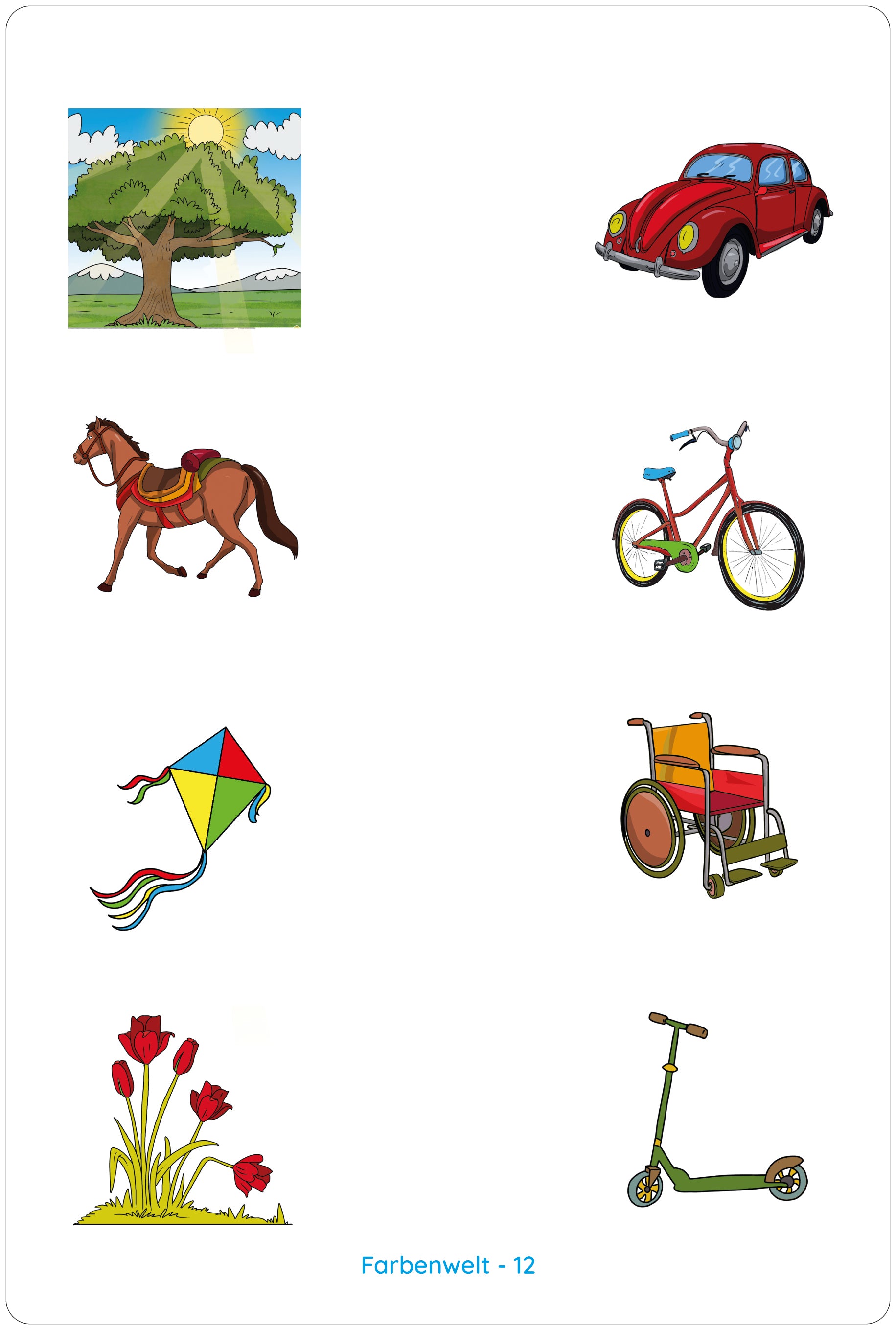 Immerse yourself in the fascinating "world of colors". The card set contains 15 varied exercise cards, which are all about correctly assigning color arrangements, patterns or divisions of the respective illustrations.