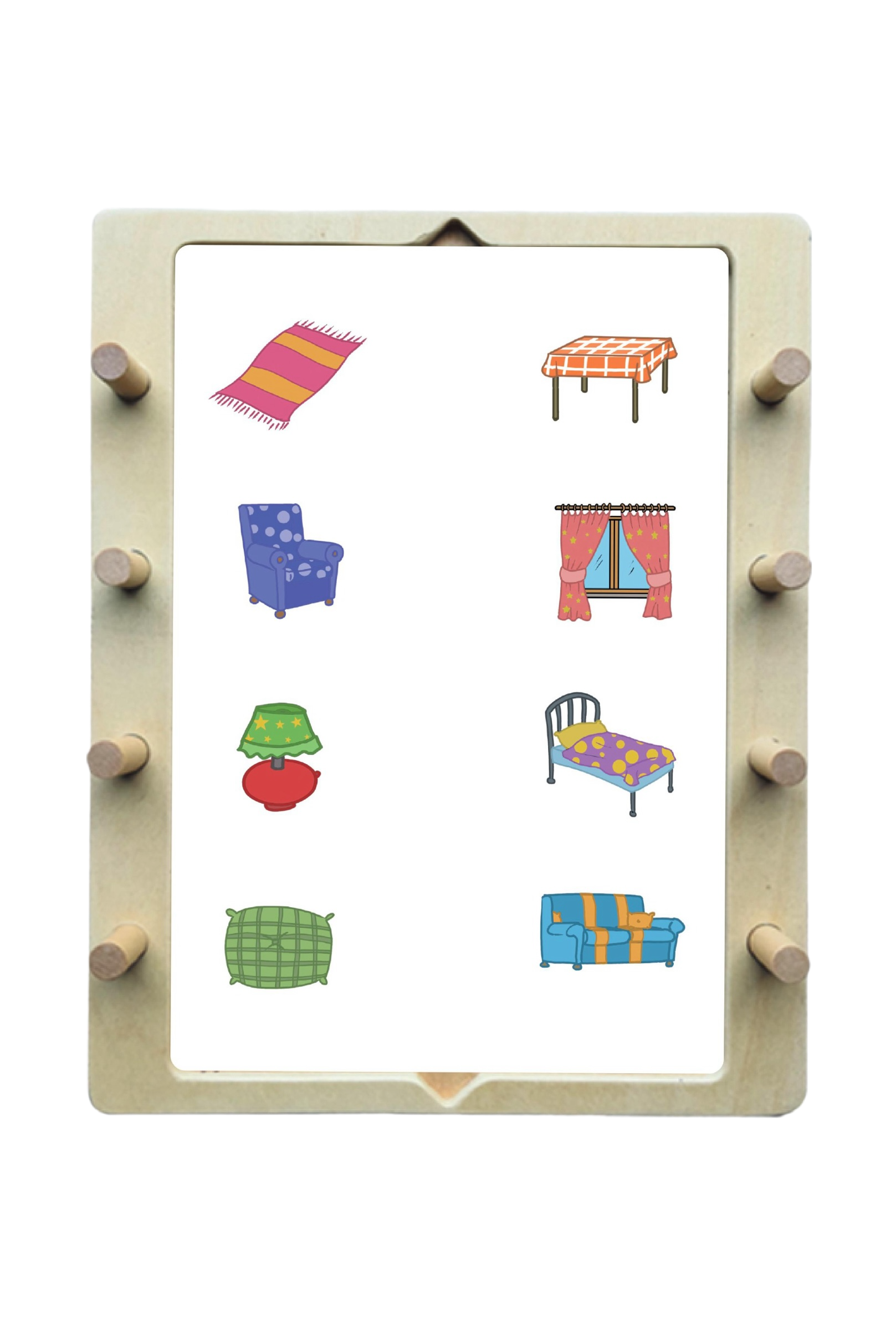 - Connect the illustrations on the left side of the card to the matching pictures on the right by stretching the rubber bands over the wooden pegs.