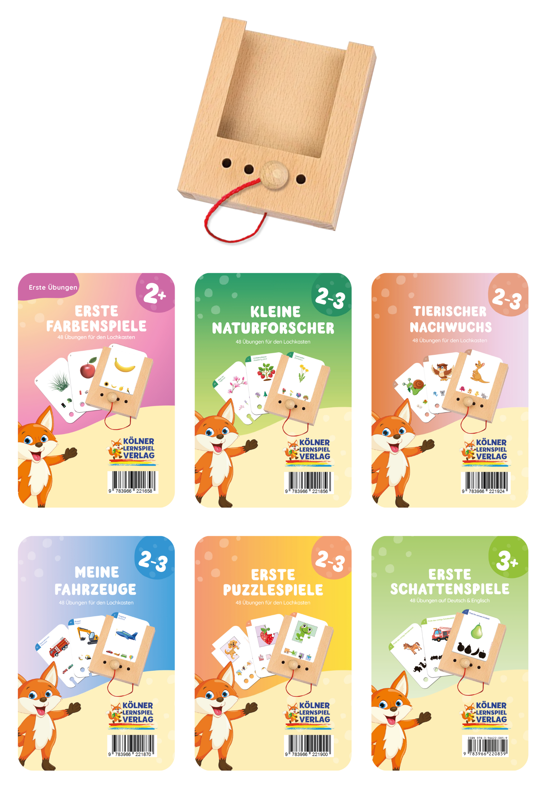 Das Lochkasten Starterpaket ab 2-3 Jahren bietet ein einzigartiges Lernspiel für die frühkindliche Entwicklung. Die intuitiven Kartensätze mit einfachen, realitätsgetreuen Bildern und ersten 1-zu-1 Erkennungen sind speziell auf die Altersgruppe zugeschnitten. Kinder verbinden mit dem Lochkasten Spiel & Spaß, während sie spielerisch ihr logisches Denken, sowie ihre Feinmotorik und visuelle Wahrnehmung trainieren. Die Aufgaben werden mit steigender Kartenzahl etwas anspruchsvoller und bieten eine spannende Herausforderung für Kinder.