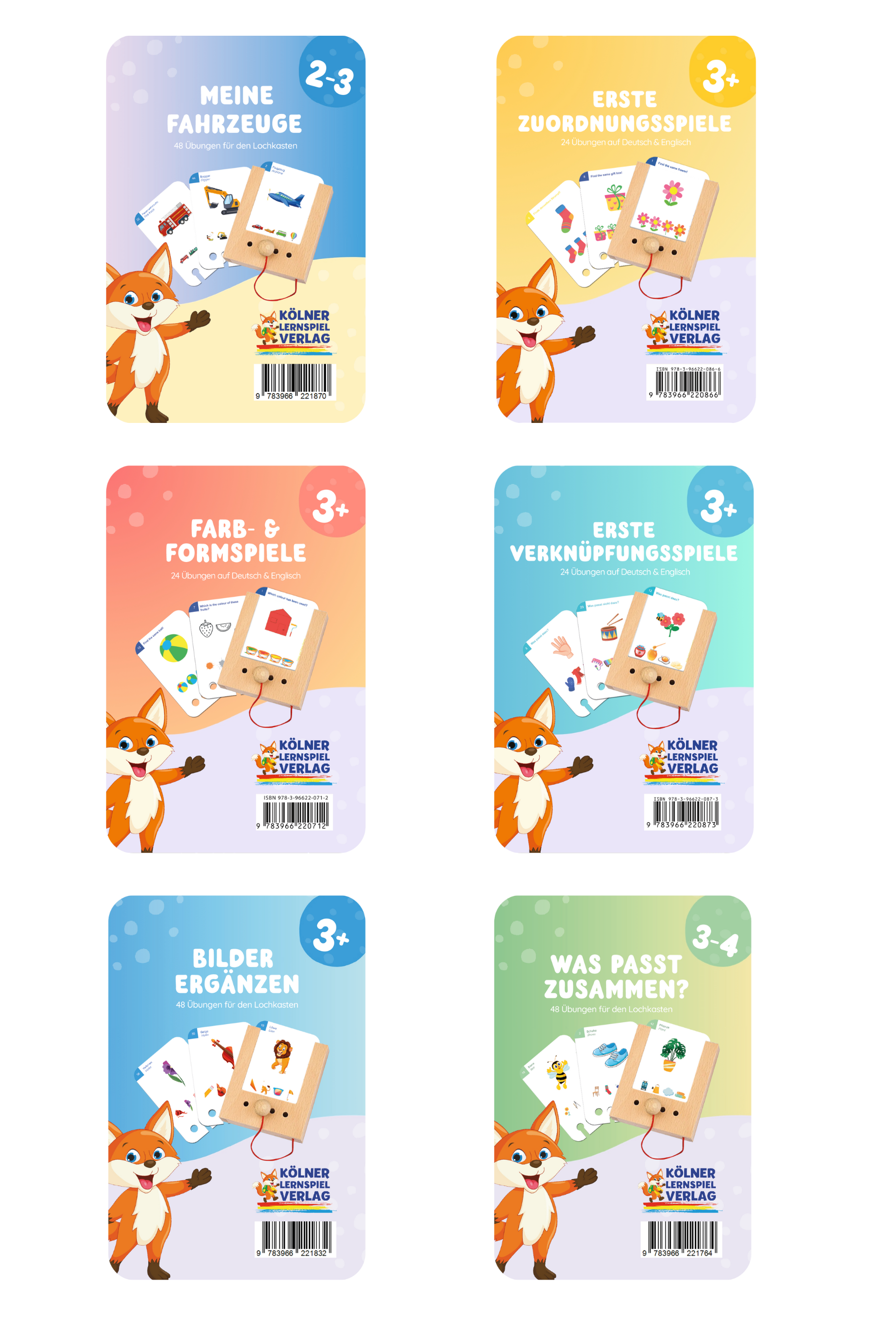 6 Kartensätze ab 3 Jahre mit bis zu 48 bilingualen Übungen (Deutsch/Englisch). Die Kartensätze fördern gezielt verschiedene Bereiche der kindlichen Entwicklung.