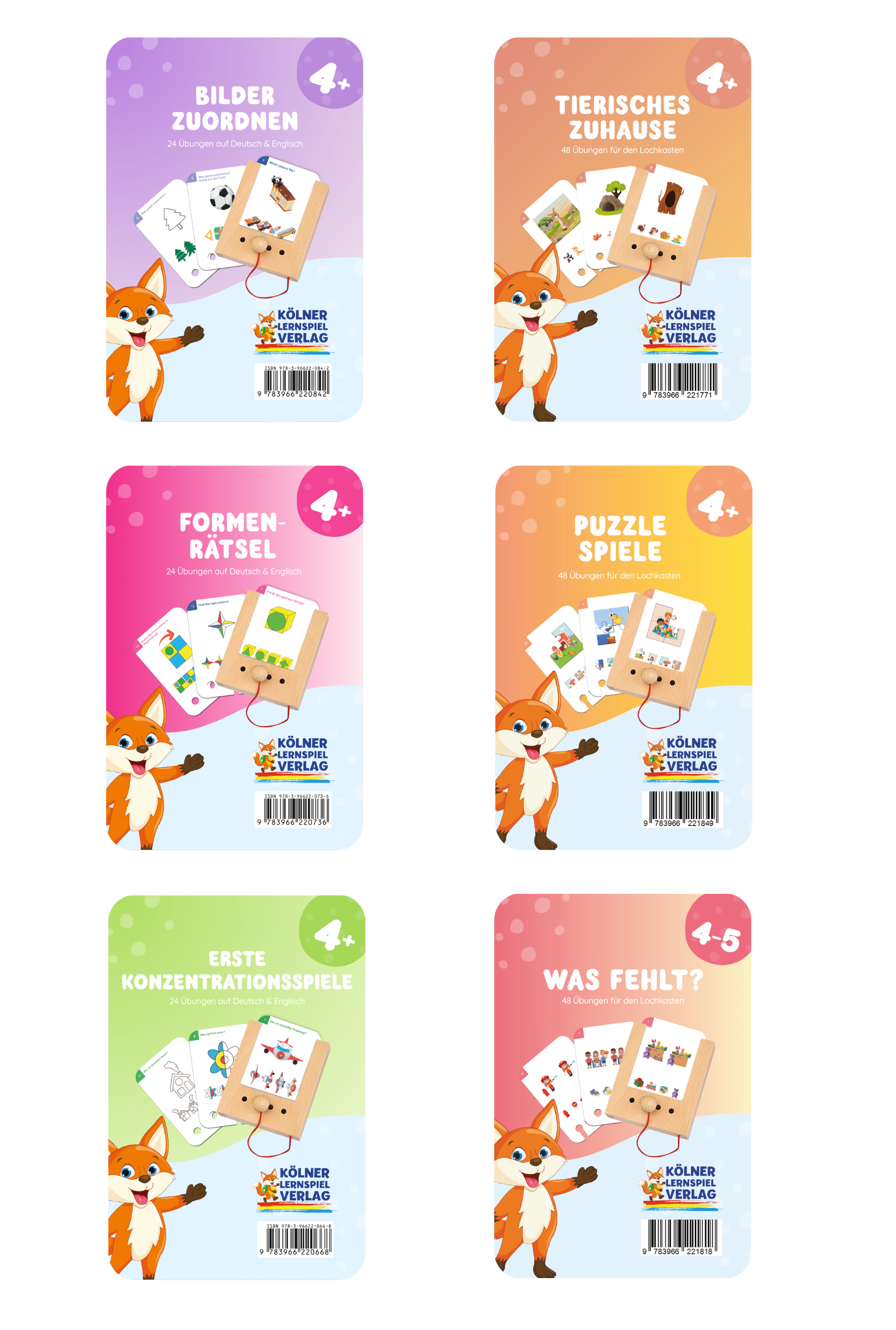 6 Kartensätze ab 4 Jahre mit bis zu 48 bilingual gestalteten Übungen (Deutsch/Englisch). Die Kartensätze fördern gezielt verschiedene Bereiche der kindlichen Entwicklung.