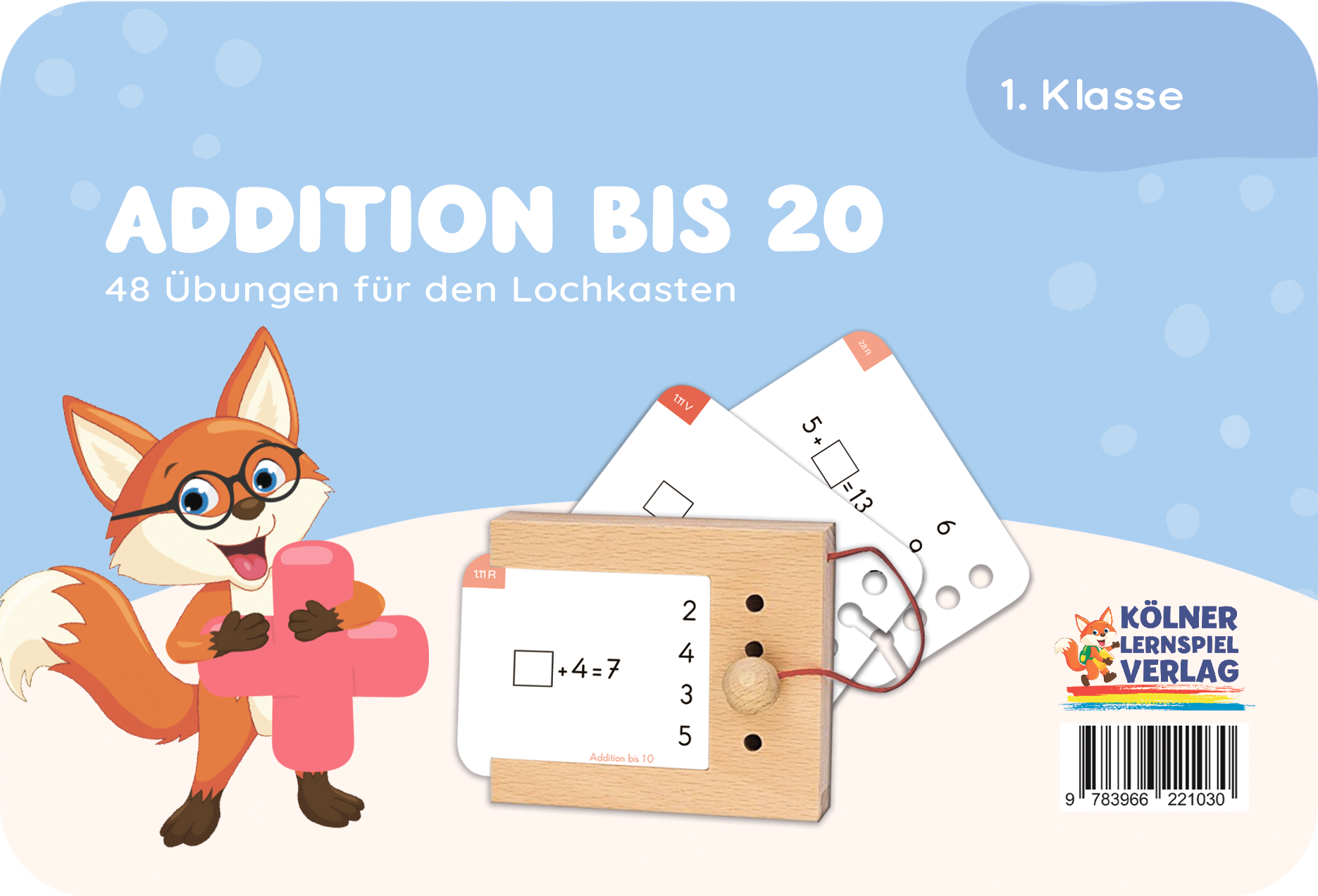 Unser Kartensatz "Addition bis 20" für den Lochkasten ermöglicht Schülerinnen und Schülern eine interaktive und lehrreiche Lernerfahrung. Mit insgesamt 48 Übungen (24 doppelseitig bedruckte Karten) werden gezielt mathematische Fähigkeiten im Bereich der Addition bis 20 trainiert. Die Aufgaben sind altersgerecht gestaltet und bieten eine spielerische Herangehensweise an das Rechnen. Die Schwierigkeit der Aufgaben steigt mit der Kartenzahl, was es zu einer spannenden Herausforderung für Kinder macht.