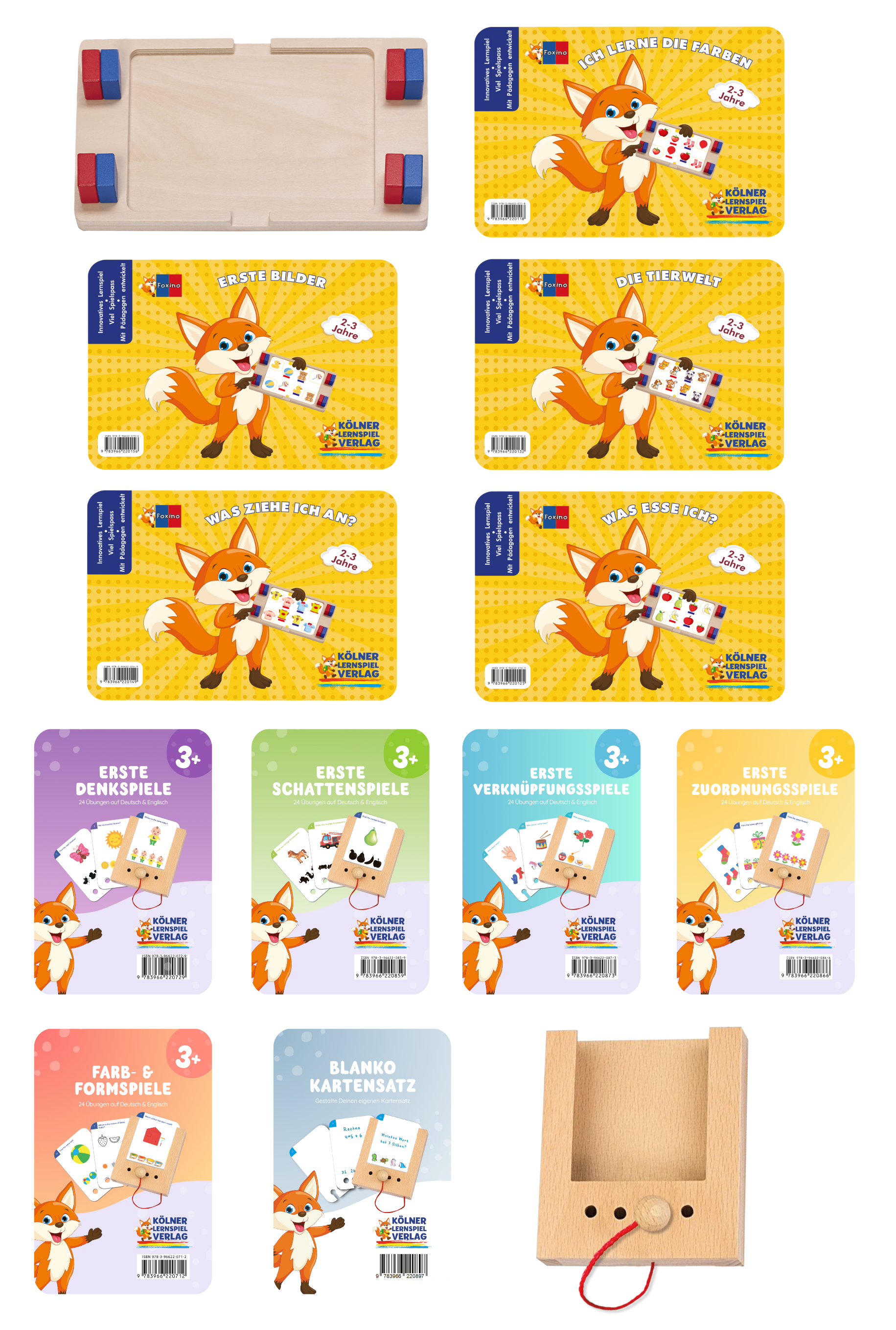 - 6 Lochkasten Kartensätze ab 3 Jahren, doppelseitig in Deutsch und Englisch bedruckt: