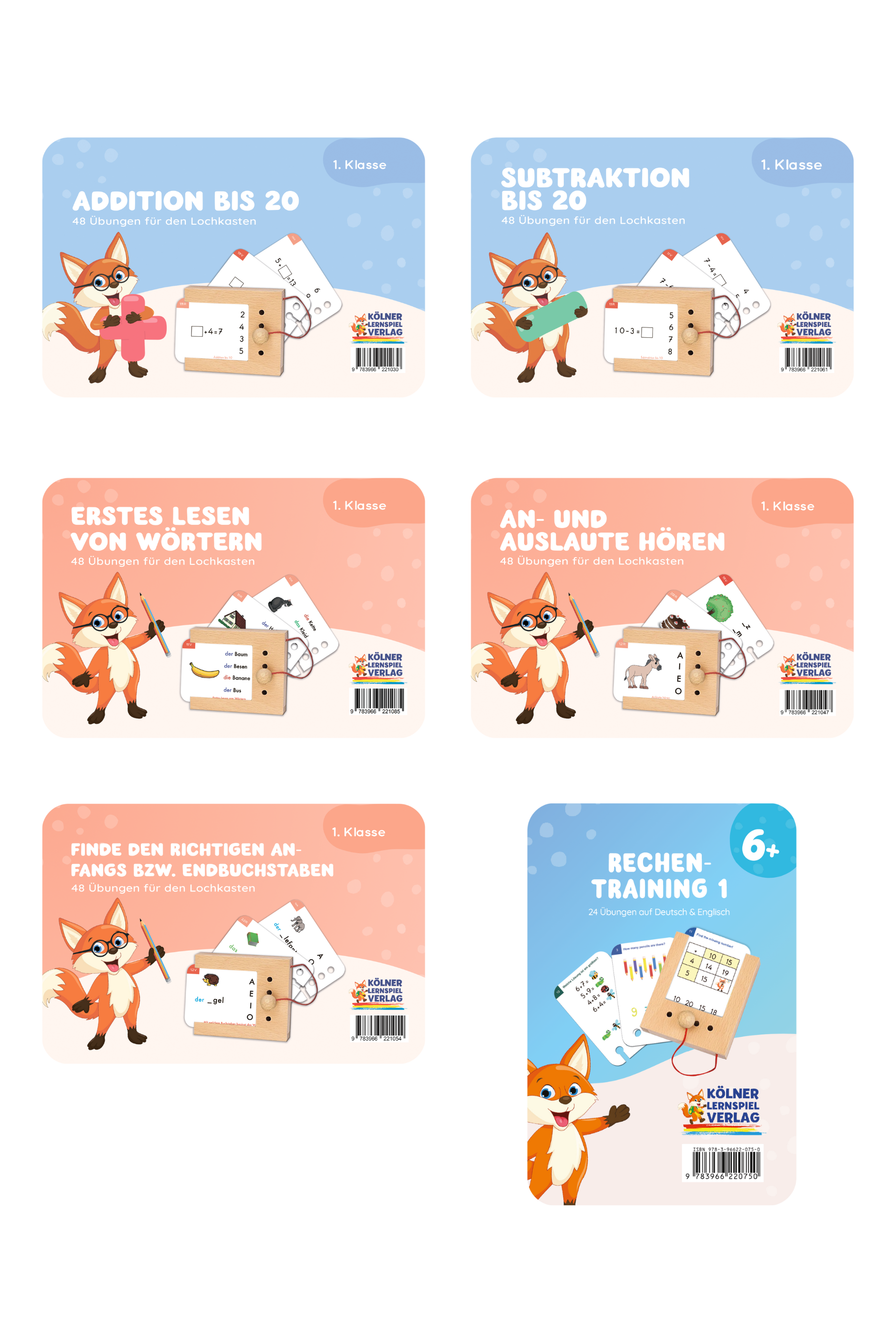 6 Lochkasten Kartensätze für die 1. Klasse mit je 24 doppelseitigen Karten (48 Aufgabenstellungen). Die Kartensätze umfassen:
