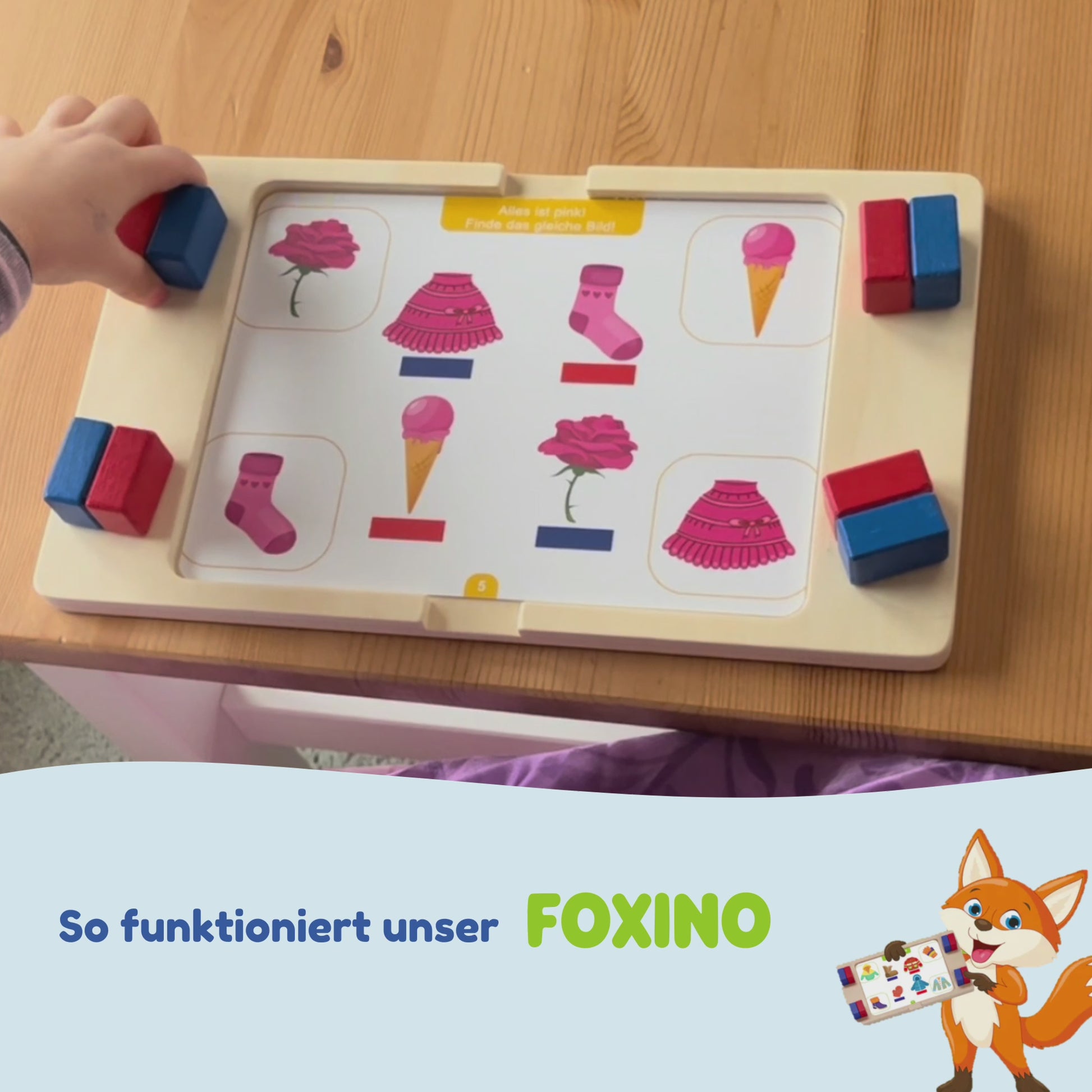 Mit unserem Foxino Starterset ab 3-4 Jahre bestehend aus Holzrahmen und 5 Lernkarten kann in die Welt bunter Objekte, Tiere, Kleidungsstücke und vielem mehr eingetaucht werden um erste kleine Rätsel zu lösen. Nach dem Prinzip der Selbstkontrolle können sich die Kleinen damit entspannt zurückziehen und spielerisch ihre Wahrnehmung, Logik & Konzentration trainieren.