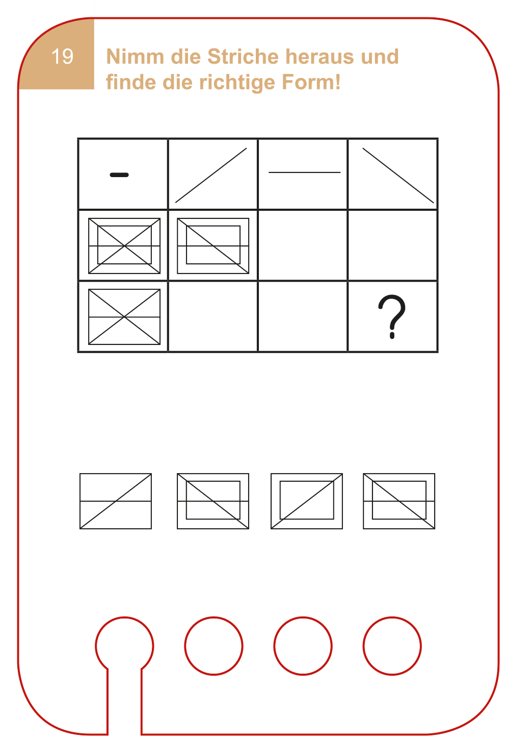 Der Kartensatz "Intelligenz Training" umfasst 24 anspruchsvolle Übungen, die darauf abzielen, das analytische Denkvermögen von Kindern ab 6 Jahren zu fördern. Die Kinder werden herausgefordert, komplexe Muster und Zusammenhänge zu erkennen und logische Schlussfolgerungen zu ziehen. Durch die vielfältigen Aufgaben bietet das Intelligenz Training ein unterhaltsames und geistig stimulierendes Lernerlebnis. Die Schwierigkeit der Aufgaben steigt mit der Kartenzahl, was es zu einer spannenden Herausforderung für Kinder macht.