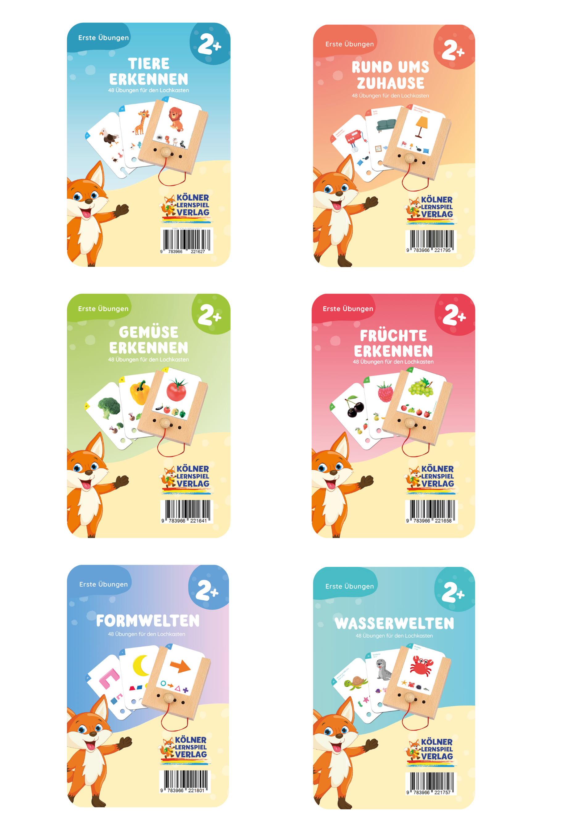 6 selbsterklärende Kartensätze ab 2 Jahre für den Lochkasten. Ein Kartensatz besteht aus 24 Karten mit 48 doppelseitig bespielbaren Übungen: