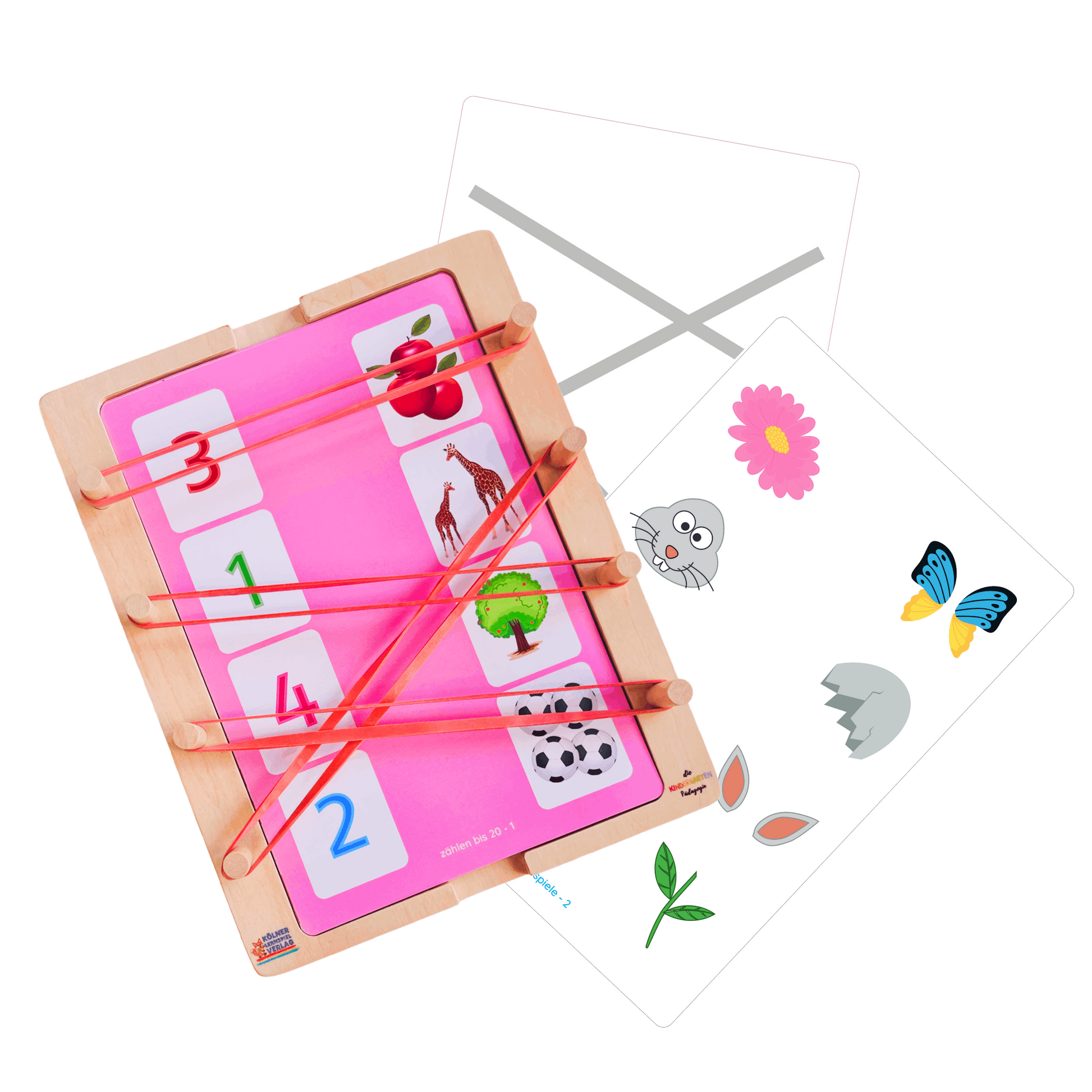 - Sobald Du alle Gummibänder gespannt hast, ziehe die Karte heraus und drehe sie um. Schiebe sie wieder in den Holzrahmen, um die Rückseite mit der Selbstkontrolle zu sehen.
